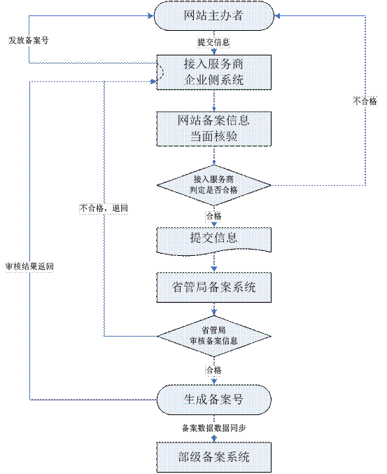 網(wǎng)站主辦者委托接入服務(wù)商代為報備網(wǎng)站的全部備案信息并核實信息真?zhèn)巍?gt;接入服務(wù)商核實備案信息——>將備案信息提交到省管局系統(tǒng)。